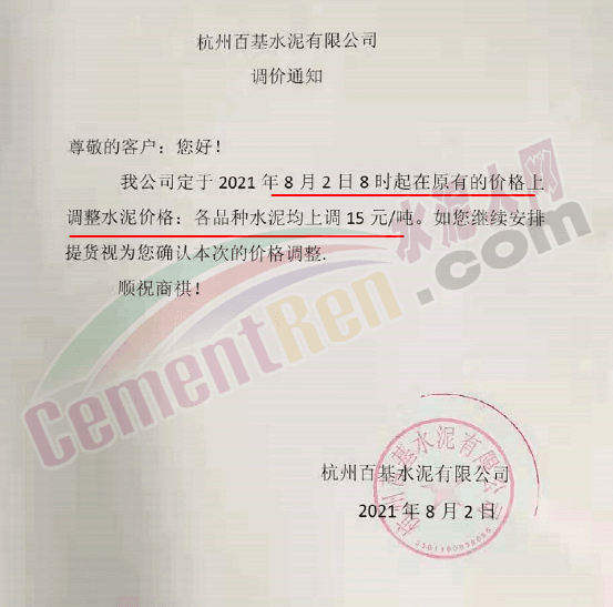 杭州百基水泥通知8月2日8时起在原有价格上各品种水泥上调15元/吨。