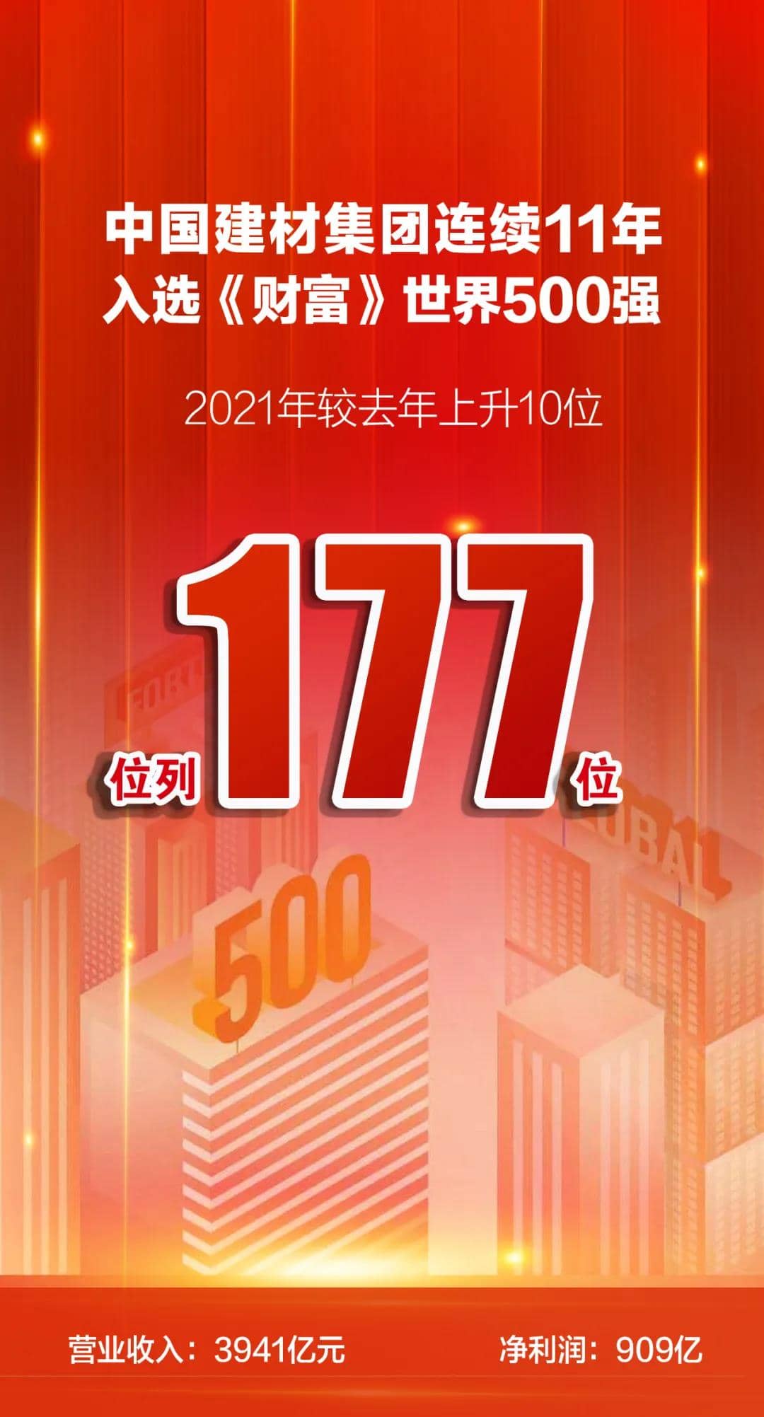 8月2日,2021年《财富》世界500强排行榜发布,中国建材集团以571.15亿美元连续第11年入围该榜单,位列177位,比上一年度前进10位,继续稳坐全球建材行业榜首位置。同时上榜的建材企业还有法国圣戈班集团266位,安徽海螺集团315位,爱尔兰CRH441位。