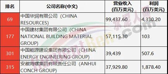 国内企业经营项目中包含水泥业务的上榜企业有:中国华润有限公司;中国能源建设集团有限公司。上述四家企业排名、营业收及利润如下表: