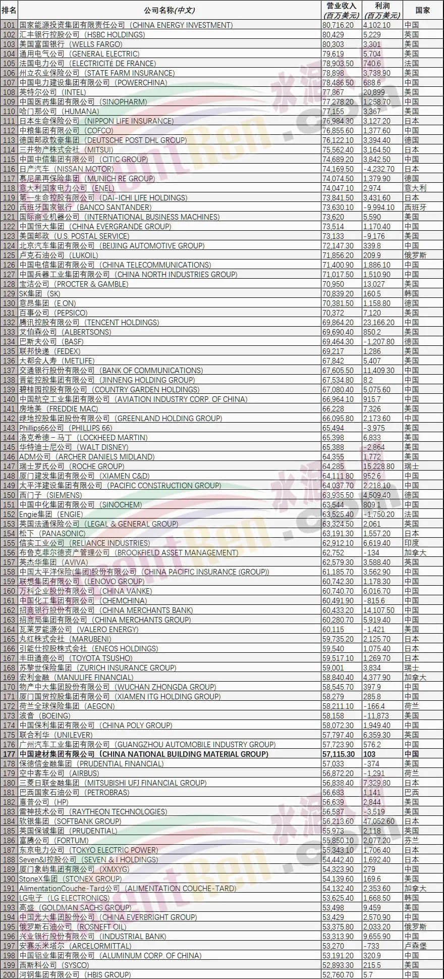 中国建材集团连续第11年入围榜单,2021年的排名为第177位。继续稳坐全球建材企业榜首。