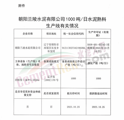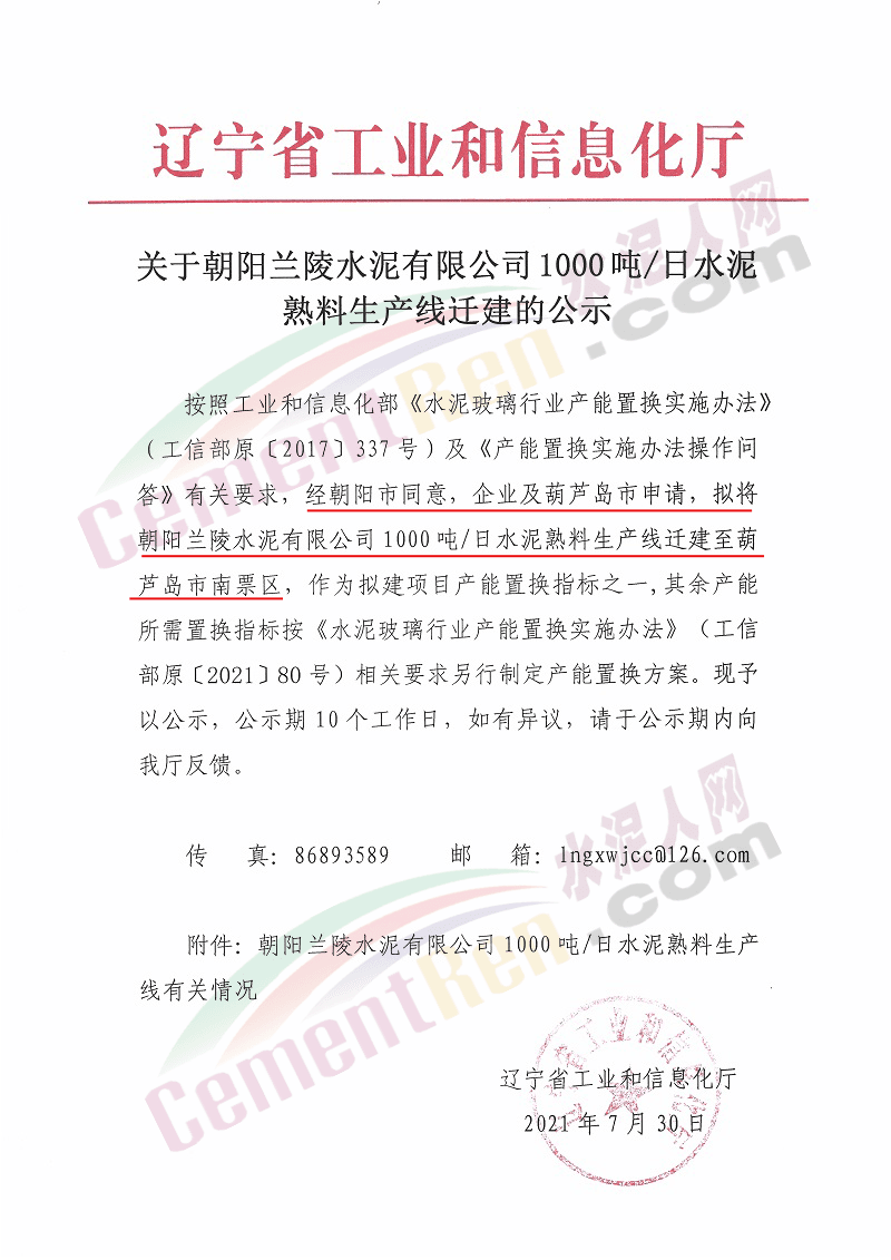7月30日,辽宁省工信厅发布关于朝阳兰陵水泥有限公司1000吨/日水泥熟料生产线迁建的公示。方案经朝阳市同意、企业和葫芦岛市申请,拟将朝阳兰陵水泥有限公司1000吨/日水泥熟料生产线迁建至葫芦岛市南票区,原址生产线计划在2023年10月25日关停,公示如下: