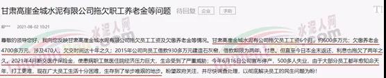 近日,有网友反映,甘肃高崖金城水泥有限公司拖欠员工工资6个月,约600多万元,欠缴养老金4700多万元,涉及470人,欠缴时间达十年之久;