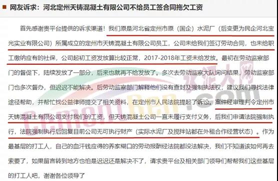 2021年7月20日,有网友在阳光理政平台反映,河北省定州市原(国企)水泥厂(后变更为民企河北宝光实业有限公司)所属成立的定州市天铸混凝土有限公司,未给职工签订劳动合同,也未给职工缴纳应有的社保,公司起初工资发放算比较正常,但2017-2018年工资未给发放。