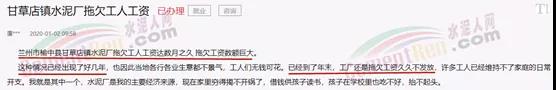 2021年1月2日,有网友在人民网留言板反映,甘肃省兰州市榆中县甘草店镇水泥厂拖欠工人工资达数月之久,拖欠工资数额巨大。年末工厂还是拖欠工资久久不发放,许多工人已经维持不了家庭的日常开支。