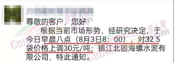 镇江北固海螺水泥通知于8月3日早8点起32.5袋价格上调30元/吨。