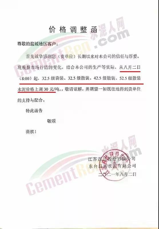 江苏磊达水泥通知盐城地区客户,从8月2日8时起,32.5级、42.5级水泥价格上调30元/吨。