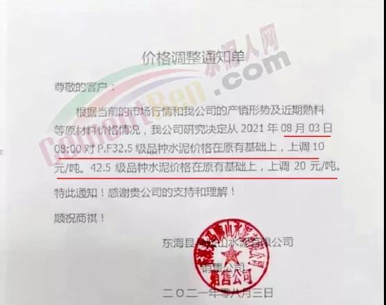 连云港东海县马陵山水泥有限公司通知根据当前的市场行情及公司的产销形势和近期熟料等原材料的价格情况,从8月3日8时起对P.F32.5级品种水泥价格上调10元/吨,42.5级品种水尼价格上调20元/吨。