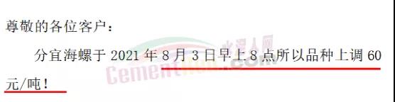 江西分宜海螺通知自8月3日早8点起水泥价格上调60元/吨。