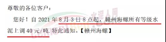 湖南省娄底市双峰海螺水泥通知,根据当前市场行情以及材料成本上涨等情况,经公司研究决定,自8月3日8时起,对所有区域各品种水泥的出厂价格上调40元/吨。