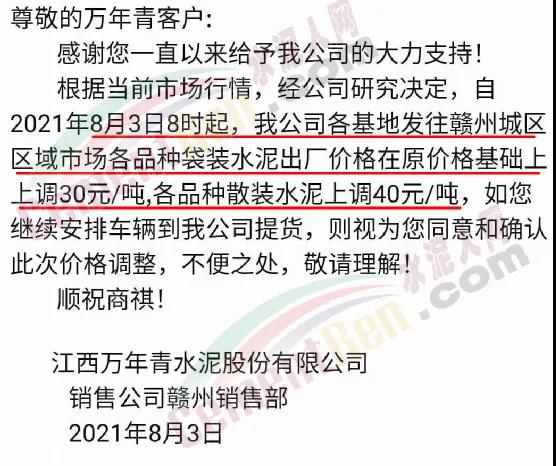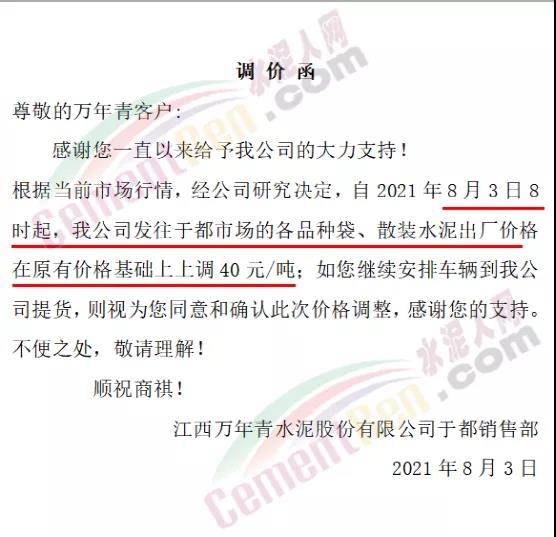 江西万年青水泥股份有限公司于都销售部发调价函称,根据当前市场行情,经公司研究决定,自8月3日8时起,公司发往于都市场的各品种袋、散装水泥出厂价格在原有基础上上调40元/吨。