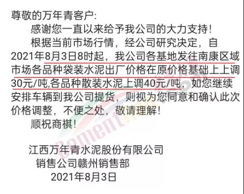 江西万年青水泥股份有限公司赣州销售部通知,根据当前市场行情,经公司研究决定,自8月3日8时起,公司各基地发往南康区域市场各品种袋装水泥出厂价格在原价格基础上上调30元/吨,各品种散装水泥上调40元/吨。