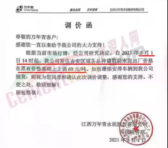 江西万年青兴国销售部通知,自8月1日14时起,公司发往吉安区域各品种袋散装水泥出厂价格在原有基础上上调60元/吨。