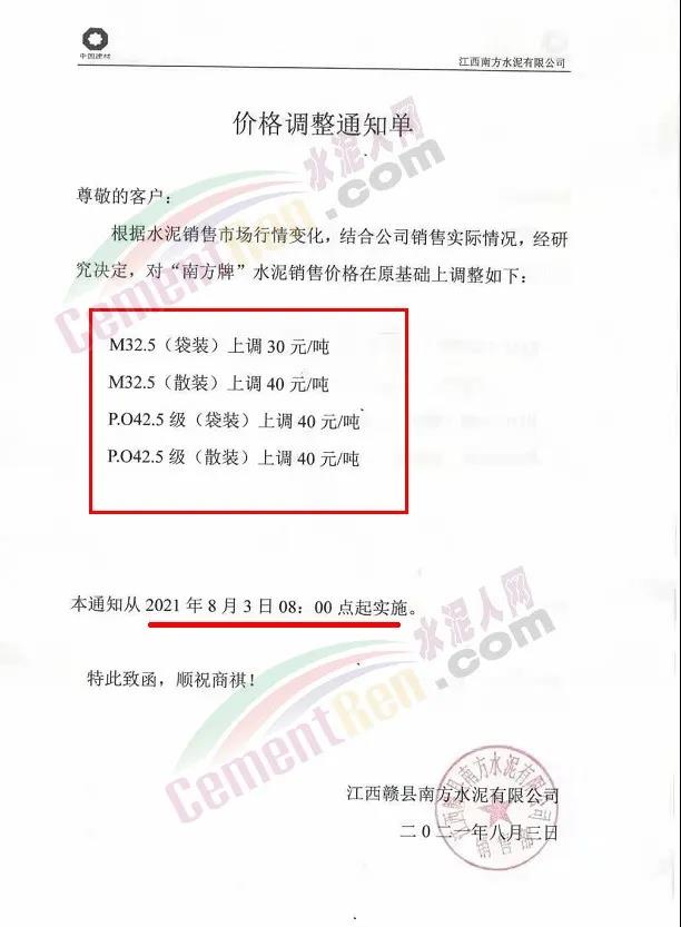 江西赣县南方水泥有限公司通知,8月3日上午8时起32.5袋装上调30元/吨,32.5袋装上调30元/吨。32.5散装及42.5袋装和散装水泥上调40元/吨。