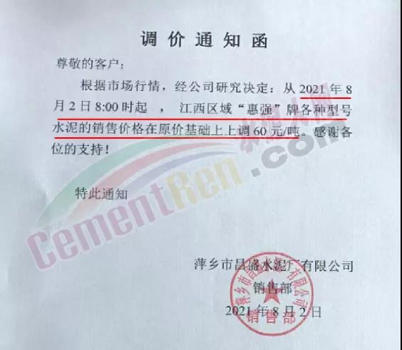 江西萍乡市昌盛水泥厂有限公司通知,从8月2日8时起,江西区域“惠强”牌各标号水泥在原价基础上上调60元/吨。