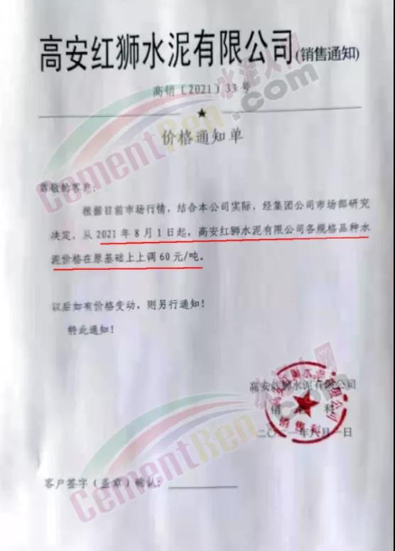 高安红狮水泥通知根据目前市场行情,结合公司实际,经集团公司市场部研究决定,自8月1日起,高安红狮水泥有限公司各规格品种水泥价格在原基础上上调60元/吨。