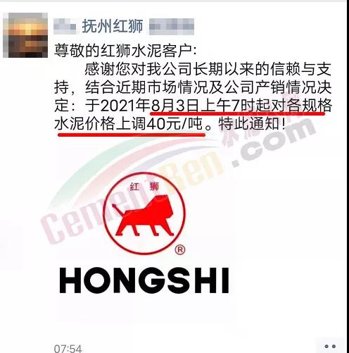 江西抚州红狮水泥通知自8月3日上午7时起,对各规格水泥价格上调40元/吨。