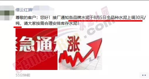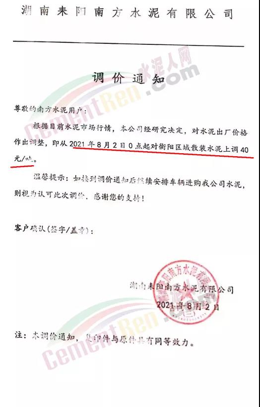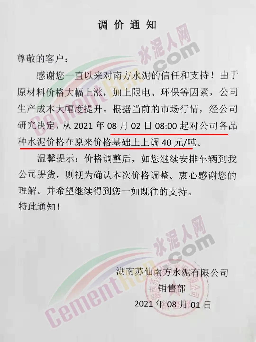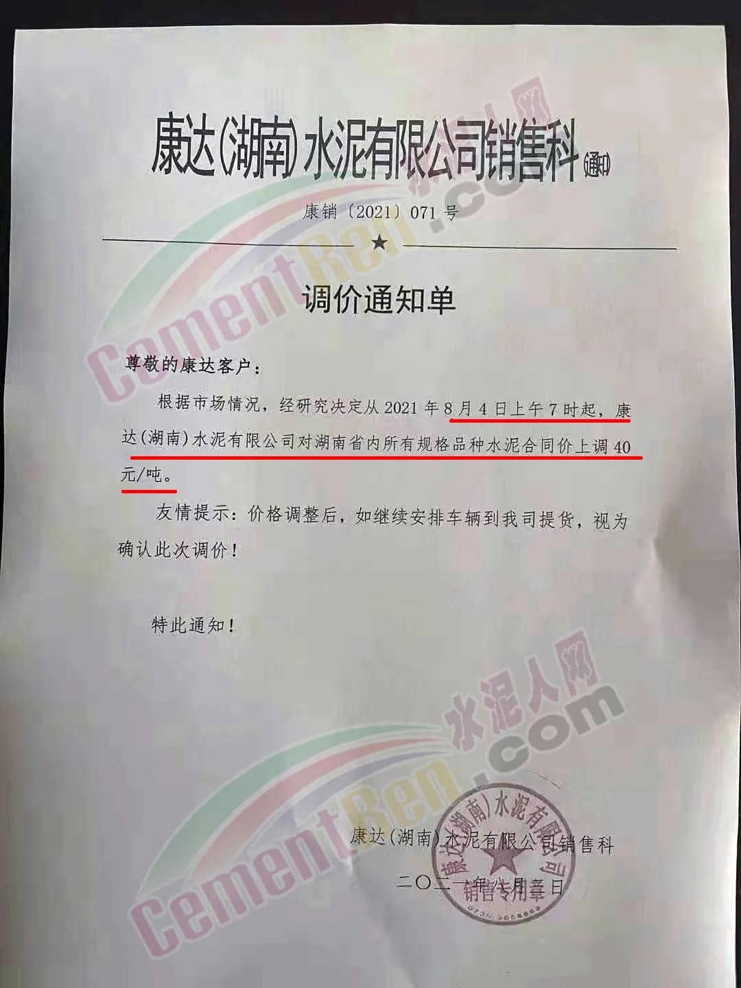 康达湖南水泥有限公司销售科发调价通知单称:根据市场情况,经研究决定从8月4日上午7时起,康达(湖南)水泥有限公司对湖南省内所有规格品种水泥合同价上调40元/吨。