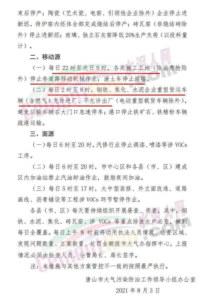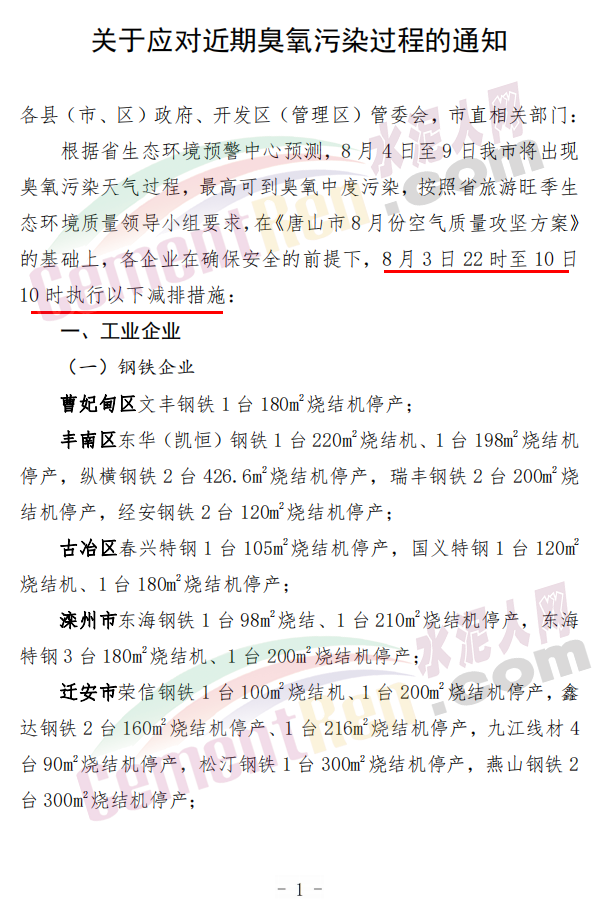 8月3日唐山市发布《关于应对近期臭氧污染过程的通知》称,8月3日22时至10日10时执行减排措施: