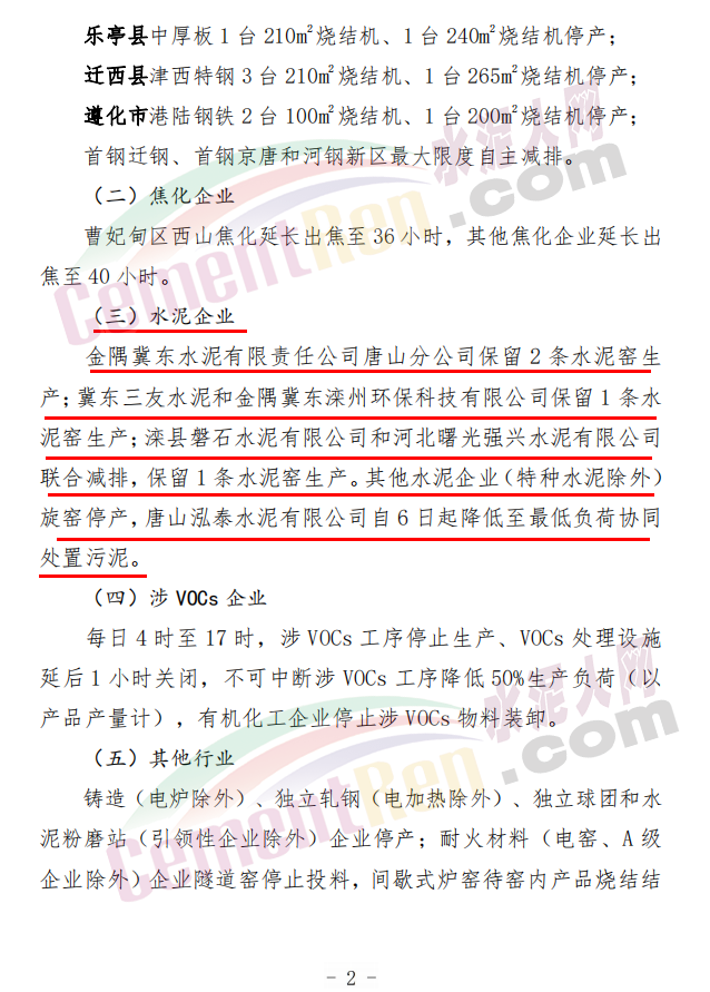唐山飞龙水泥有限责任公司、唐山燕东水泥股份有限公司、唐山耀东水泥有限公司、唐山弘也水泥有限公司、唐山圣龙水泥有限公司等5家B级企业停产15天;