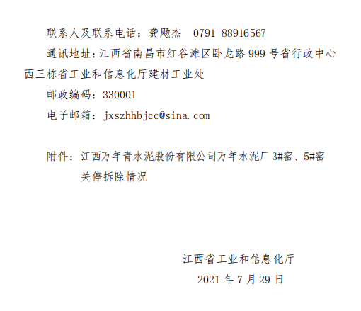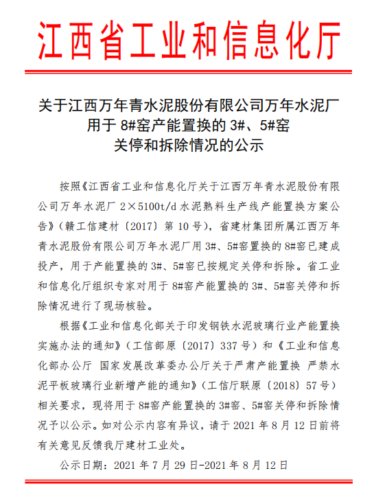 同期,江西省工业和信息化厅发布《关于江西万年青水泥股份有限公司万年水泥厂用于8#窑产能置换的3#、5#窑关停和拆除的公示》称,按照《江西省工业和信息化厅关于江西万年青水泥股份有限公司万年水泥厂2×5100t/d水泥熟料生产线产能置换方案公告》(赣工信建材〔2017〕第10号),省建材集团所属江西万年青水泥股份有限公司万年水泥厂用3#、5#窑置换的8#窑已建成投产,用于产能置换的3#、5#窑已按规定关停和拆除。省工业和信息化厅组织专家对用于8#窑产能置换的3#、5#窑关停和拆除情况进行了现场核验。