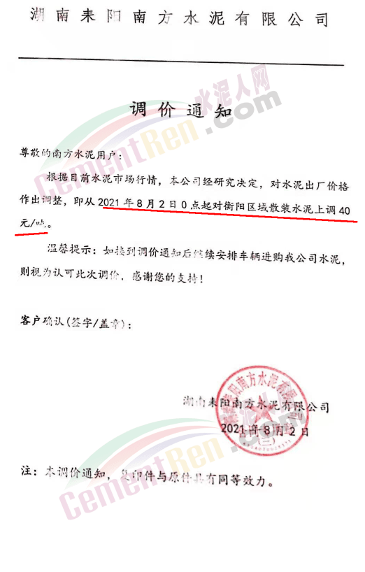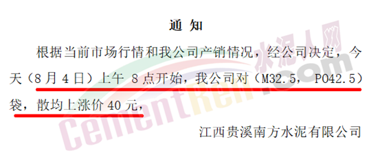 江西贵溪南方水泥有限公司通知,根据当前市场行情和企业产销情况,8月4日8时起,对M32.5、PO42.5袋、散装水泥涨价40元/吨。