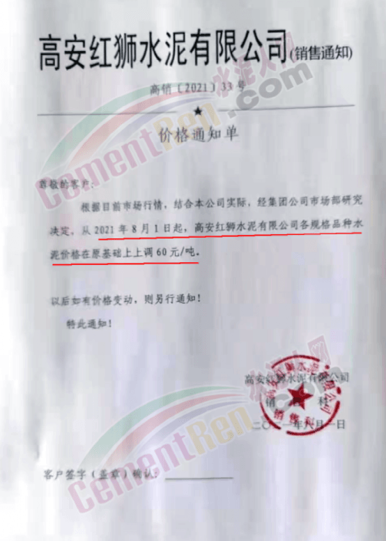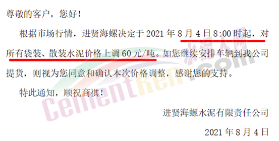 进贤海螺水泥有限责任公司通知,于2021年8月4日8时起,对所有袋装、散装水泥价格上调60元/吨。