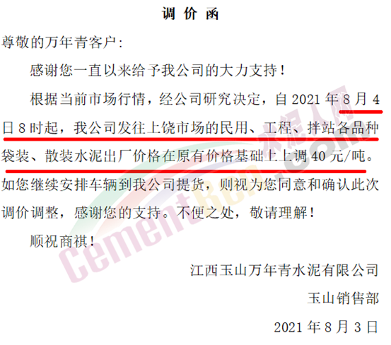 江西玉山万年青水泥有限公司通知8月4日8时起,发往上饶市场的民用、工程、拌站各品种袋装、散装水泥出厂价格在原有价格基础上上调40元/吨。