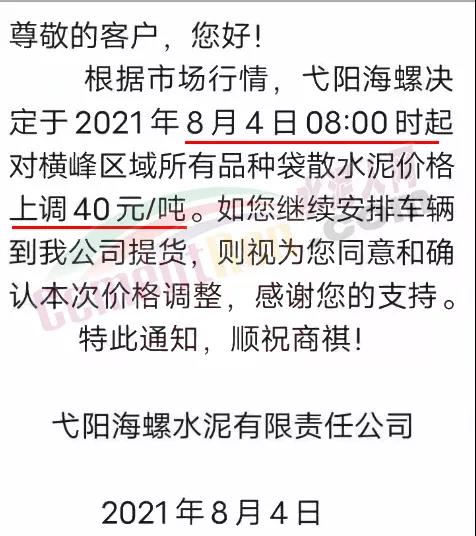 弋阳海螺通知自8月4日8时起对横峰区域所有品种袋散装水泥价格上调40元/吨。