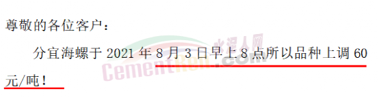 分宜县海螺水泥通知自8月3日早8点起水泥价格上调60元/吨。