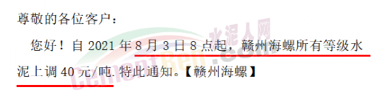 赣州海螺通知,自8月3日8点起所有等级水泥上调40元/吨。