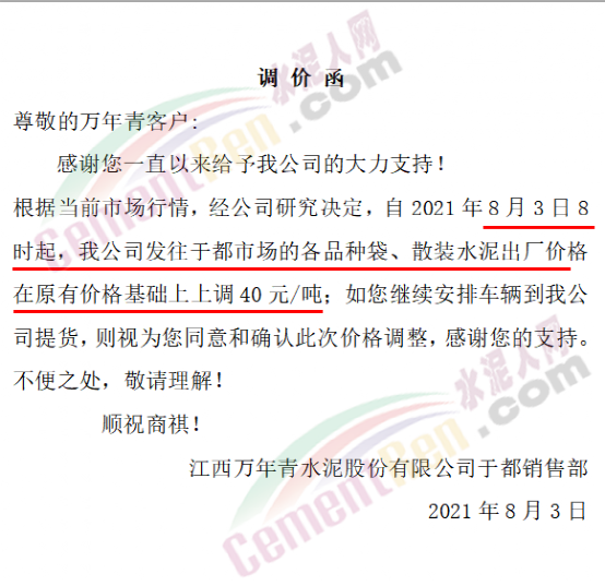 江西万年青水泥股份有限公司于都销售部发调价函称,根据当前市场行情,经公司研究决定,自8月3日8时起,公司发往赣州市于都市场的各品种袋、散装水泥出厂价格在原有基础上上调40元/吨。