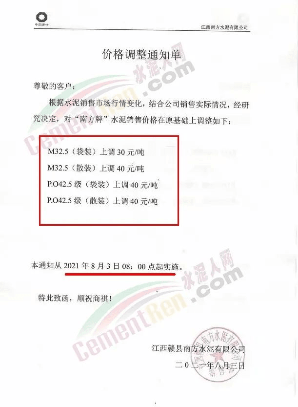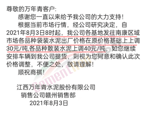 江西万年青水泥股份有限公司赣州销售部通知,根据当前市场行情,经公司研究决定,自8月3日8时起,公司各基地发往赣州市南康区域市场各品种袋装水泥出厂价格在原价格基础上上调30元/吨,各品种散装水泥上调40元/吨。