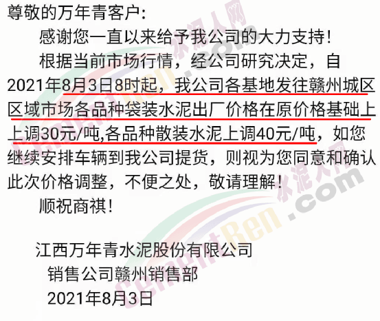 江西万年青水泥股份有限公司赣州销售部通知,自8月3日8时起,公司各基地发往赣州城区区域市场各品种袋装水泥出厂价格在原价格基础上上调30元/吨,各品种散装水泥上调40元/吨。