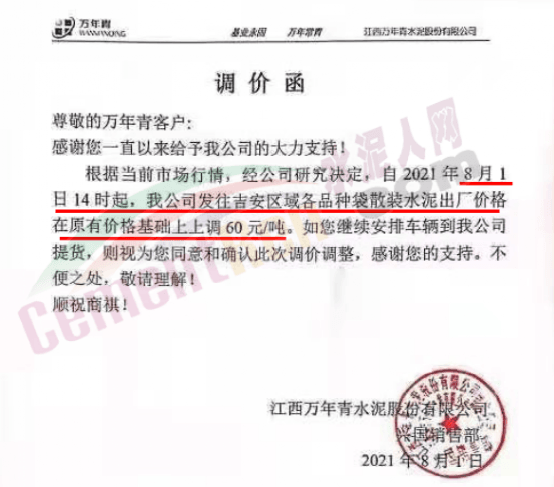 江西万年青江西赣州兴国县销售部通知,自8月1日14时起,公司发往吉安区域各品种袋散装水泥出厂价格在原有基础上上调60元/吨。