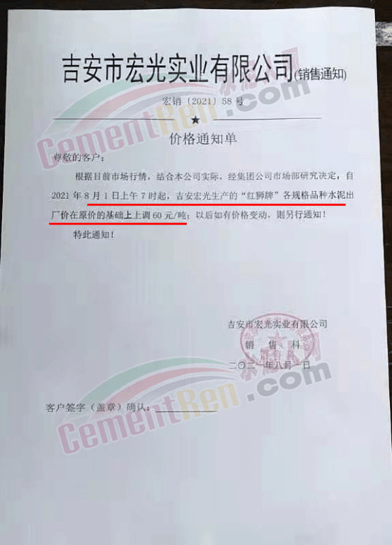 吉安宏光实业有限公司销售部通知根据目前市场行情。结合公司实际,经集团公司市场部研究决定,自8月1日上午7时起,吉安宏光生产的“红狮牌”各规格品种水泥出厂价在原价基础上上调60元/吨。
