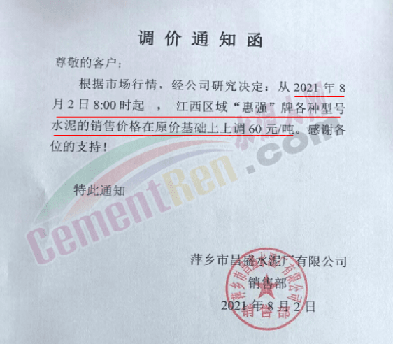 江西萍乡市昌盛水泥厂有限公司通知,从8月2日8时起,江西区域“惠强”牌各标号水泥在原价基础上上调60元/吨。
