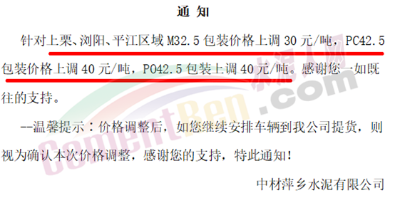 中材萍乡水泥通知,针对上栗、浏阳、平江区域M32.5包装价格上调30元/吨,PC42.5包装价格上调40元/吨,PO42.5包装上调40元/吨。
