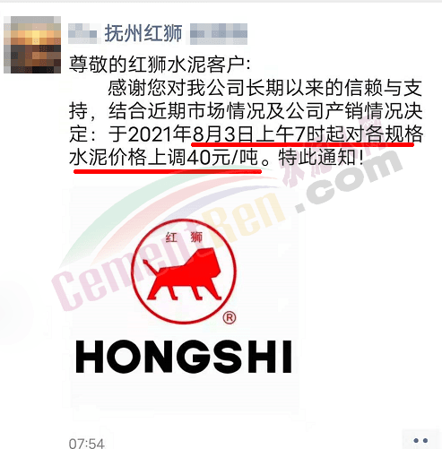 江西抚州红狮水泥通知自8月3日上午7时起,对各规格水泥价格上调40元/吨。