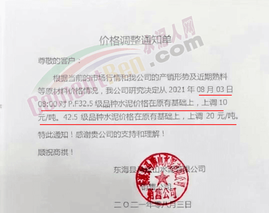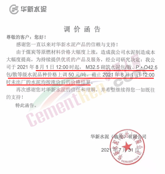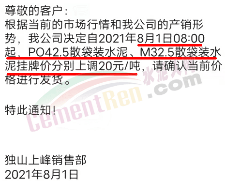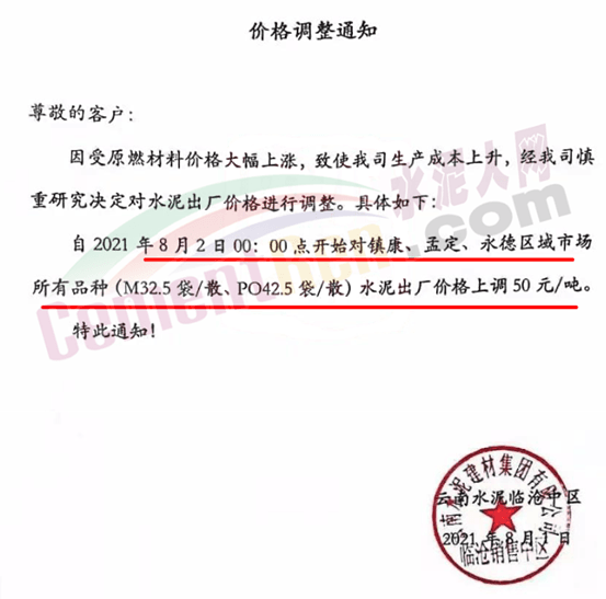 华新水泥(临沧)有限公司通知由于煤炭等原燃材料价格大幅度上涨,造成公司水泥制造成本大幅度提高,为持续提供优质的产品及服务,经研究决定于2021年8月1日12时起,M325砌筑水泥包/散、P·O42.5包/散等级水泥品种价格上调50元/吨。