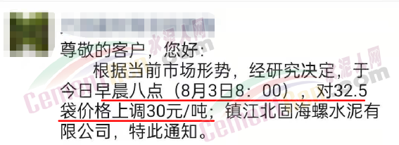 镇江北固海螺水泥通知于8月3日早8点起32.5袋价格上调30元/吨。
