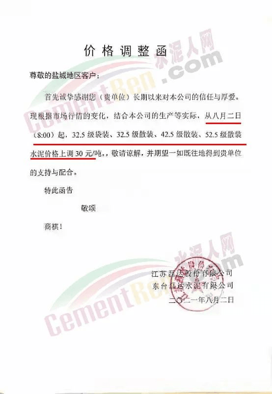 江苏磊达水泥通知盐城地区客户,从8月2日8时起,32.5级、42.5级水泥价格上调30元/吨。