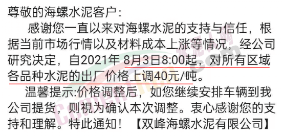 湖南省娄底市双峰海螺水泥通知,根据当前市场行情以及材料成本上涨等情况,经公司研究决定,自8月3日8时起,对所有区域各品种水泥的出厂价格上调40元/吨。