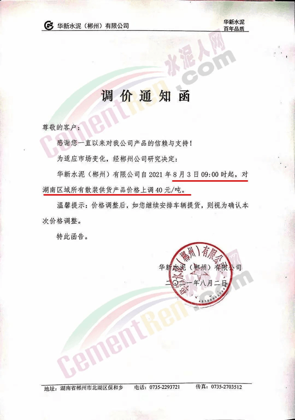 华新水泥(郴州)有限公司自8月3日上午9时起,对湖南区域所有散装供货产品价格上调40元/吨。