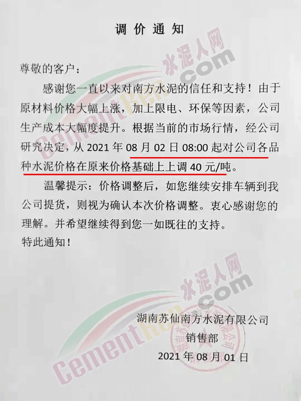 湖南郴州市苏仙区南方水泥有限公司调价通知称,由于原材料价格大幅上涨,加上限电、环保等因素,公司生产成本大幅度提升。根据当前的市场行情,经公司研究决定,从8月2日8时起对公司各品种水泥价格在原来价格基础上上调40元/吨。