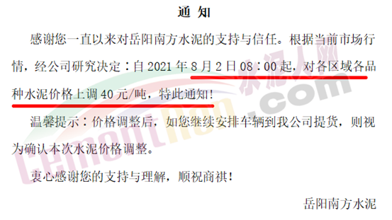 岳阳南方水泥通知8月2日8时起,对各区域各品种水泥价格上调40元/吨。