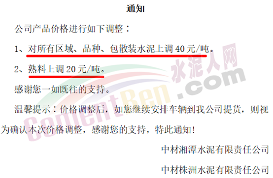 中材湘潭水泥有限责任公司(中材株洲水泥有限责任公司)通知对所有区域、品种、包散装水泥上调40元/吨。熟料上调20元/吨。