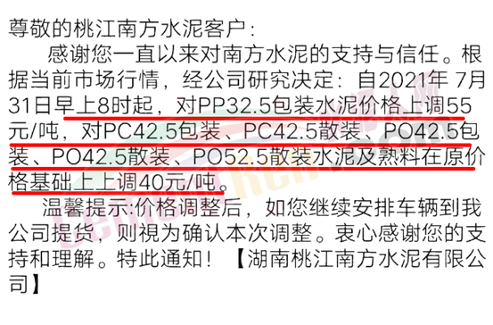 桃江南方水泥通知根据当前市场行情,经研究决定∶自7月31日早上8时起,对PP32.5包装水泥价格上调55元/吨,对PC42.5包装、PC42.5散装、PO42.5包装、PO42.5散装、PO52.5散装水泥及熟料在原价格基础上上调40元/吨。