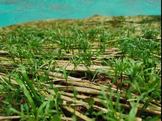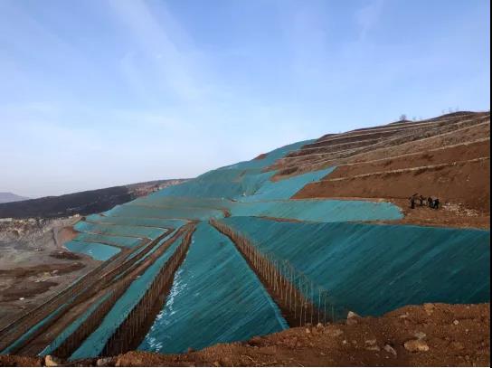 该项目所处地区为中原地区,气候干旱少雨,矿山附近水源较少,为了保证种植的树木花草能够成活,在进行喷播绿化过程中,精心调配喷播土的成分组成,灌木、乔木、冷暖花草的选择和搭配,在喷播完成后,及时进行草毡、麦秸、无纺布的覆盖保湿,有效的保证了出芽率和成活率。