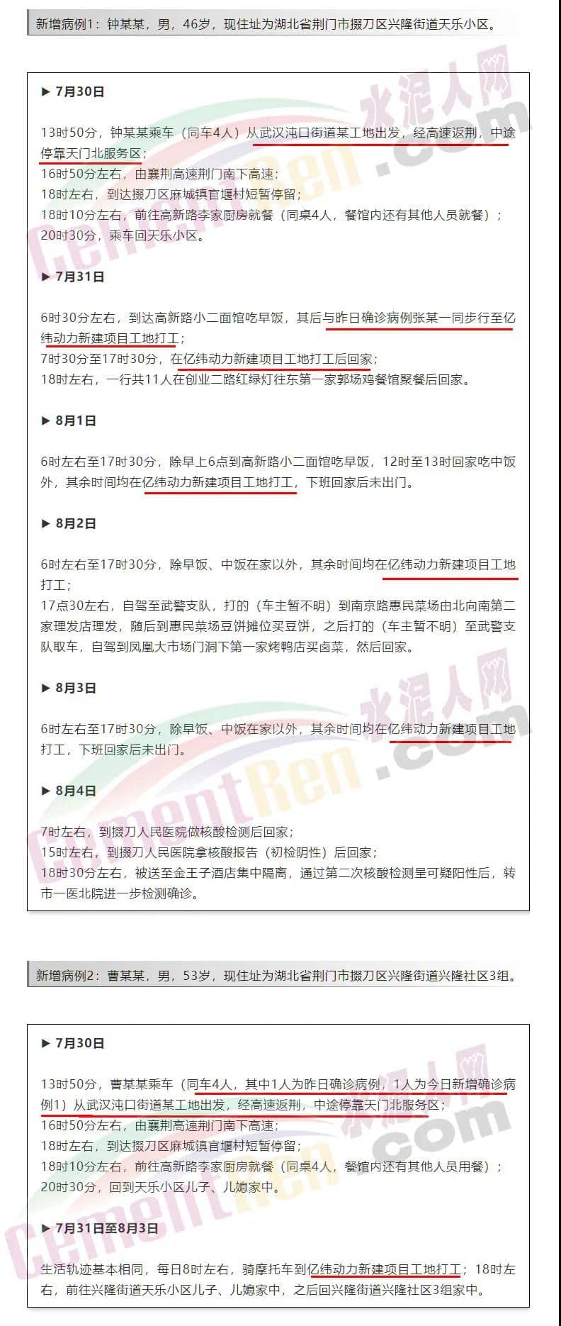 8月4日晚11时,湖北省荆门市发布消息称,在对武汉沌口返荆人员排查中,发现1例新冠肺炎确诊病例。同时,重庆市奉节县也报告了1例从武汉沌口某工地务工返渝的新冠肺炎无症状感染者。这意味着武汉工地感染链开始向外溢出。