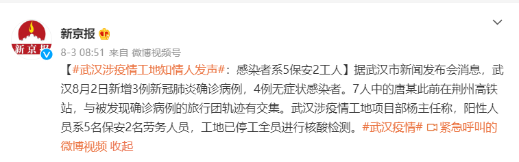据悉,8月4日9时,湖北省疫情防控指挥部召开新闻发布会,介绍全省最新疫情防控工作进展情况时提到8月3日新增确诊病例9例、无症状感染者3例,均为武汉同一工地隔离封闭管理人员。